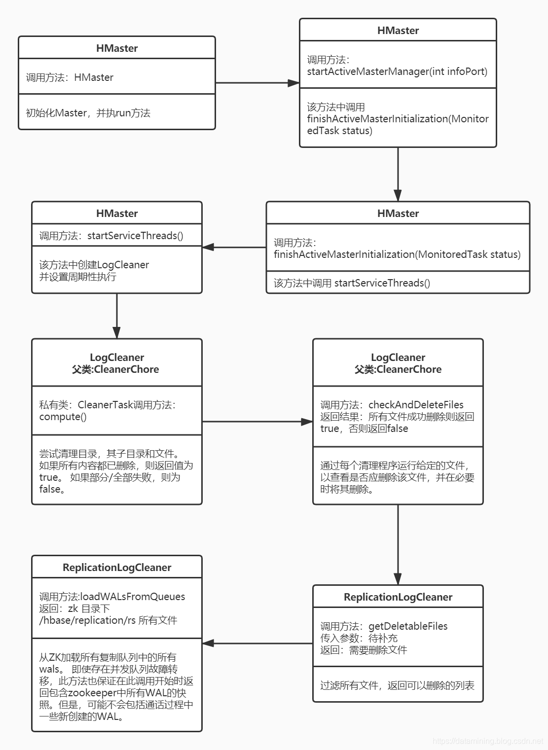 /** Start up all services. If any of these threads gets an unhandled exception* then they just die with a logged message.  This should be fine because* in general, we do not expect the master to get such unhandled exceptions*  as OOMEs; it should be lightly loaded. See what HRegionServer does if*  need to install an unexpected exception handler.*/private void startServiceThreads() throws IOException{// Start the executor service poolsthis.service.startExecutorService(ExecutorType.MASTER_OPEN_REGION,conf.getInt("hbase.master.executor.openregion.threads", 5));this.service.startExecutorService(ExecutorType.MASTER_CLOSE_REGION,conf.getInt("hbase.master.executor.closeregion.threads", 5));this.service.startExecutorService(ExecutorType.MASTER_SERVER_OPERATIONS,conf.getInt("hbase.master.executor.serverops.threads", 5));this.service.startExecutorService(ExecutorType.MASTER_META_SERVER_OPERATIONS,conf.getInt("hbase.master.executor.serverops.threads", 5));this.service.startExecutorService(ExecutorType.M_LOG_REPLAY_OPS,conf.getInt("hbase.master.executor.logreplayops.threads", 10));// We depend on there being only one instance of this executor running// at a time.  To do concurrency, would need fencing of enable/disable of// tables.// Any time changing this maxThreads to > 1, pls see the comment at// AccessController#postCreateTableHandlerthis.service.startExecutorService(ExecutorType.MASTER_TABLE_OPERATIONS, 1);startProcedureExecutor();// Initial cleaner choreCleanerChore.initChorePool(conf);// Start log cleaner thread//获取定时日志清理时间,从系统配置获取,默认为10分钟int cleanerInterval = conf.getInt("hbase.master.cleaner.interval", 60 * 1000);this.logCleaner =new LogCleaner(cleanerInterval,this, conf, getMasterFileSystem().getOldLogDir().getFileSystem(conf),getMasterFileSystem().getOldLogDir());//将任务加入定时执行,时间间隔为 cleanerInterval ,该值在LogCleaner中已经设置为定时执行间隔getChoreService().scheduleChore(logCleaner);//start the hfile archive cleaner threadPath archiveDir = HFileArchiveUtil.getArchivePath(conf);Map<String, Object> params = new HashMap<String, Object>();params.put(MASTER, this);this.hfileCleaner = new HFileCleaner(cleanerInterval, this, conf, getMasterFileSystem().getFileSystem(), archiveDir, params);getChoreService().scheduleChore(hfileCleaner);serviceStarted = true;if (LOG.isTraceEnabled()) {LOG.trace("Started service threads");}if (!conf.getBoolean(HConstants.ZOOKEEPER_USEMULTI, true)) {try {replicationZKLockCleanerChore = new ReplicationZKLockCleanerChore(this, this,cleanerInterval, this.getZooKeeper(), this.conf);getChoreService().scheduleChore(replicationZKLockCleanerChore);} catch (Exception e) {LOG.error("start replicationZKLockCleanerChore failed", e);}}try {replicationZKNodeCleanerChore = new ReplicationZKNodeCleanerChore(this, cleanerInterval,new ReplicationZKNodeCleaner(this.conf, this.getZooKeeper(), this));getChoreService().scheduleChore(replicationZKNodeCleanerChore);} catch (Exception e) {LOG.error("start replicationZKNodeCleanerChore failed", e);}}定时执行