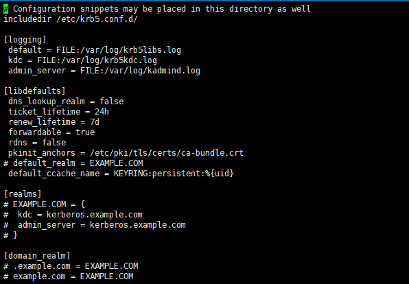 includedir /etc/krb5.conf.d/[logging]default = FILE:/var/log/krb5libs.logkdc = FILE:/var/log/krb5kdc.logadmin_server = FILE:/var/log/kadmind.log[libdefaults]dns_lookup_realm = falseticket_lifetime = 24hrenew_lifetime = 7dforwardable = truerdns = falsepkinit_anchors = /etc/pki/tls/certs/ca-bundle.crtdefault_realm = JAST.COM