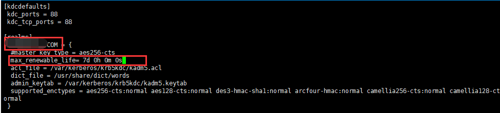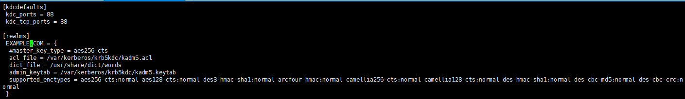 [kdcdefaults]kdc_ports = 88kdc_tcp_ports = 88[realms]JAST.COM = {#master_key_type = aes256-ctsmax_renewable_life= 7d 0h 0m 0s acl_file = /var/kerberos/krb5kdc/kadm5.acldict_file = /usr/share/dict/wordsadmin_keytab = /var/kerberos/krb5kdc/kadm5.keytabsupported_enctypes = aes256-cts:normal aes128-cts:normal des3-hmac-sha1:normal arcfour-hmac:normal camellia256-cts:normal camellia128-cts:normal des-hmac-sha1:normal des-cbc-md5:normal des-cbc-crc:normal}