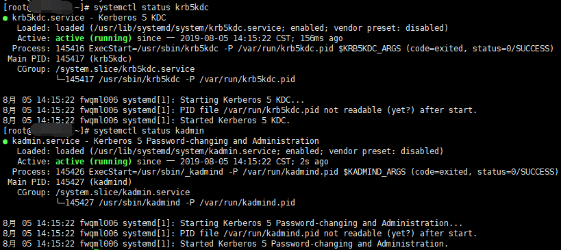 - 将Kerberos服务添加到自启动服务,并启动krb5kdc和kadmin服务,查看状态