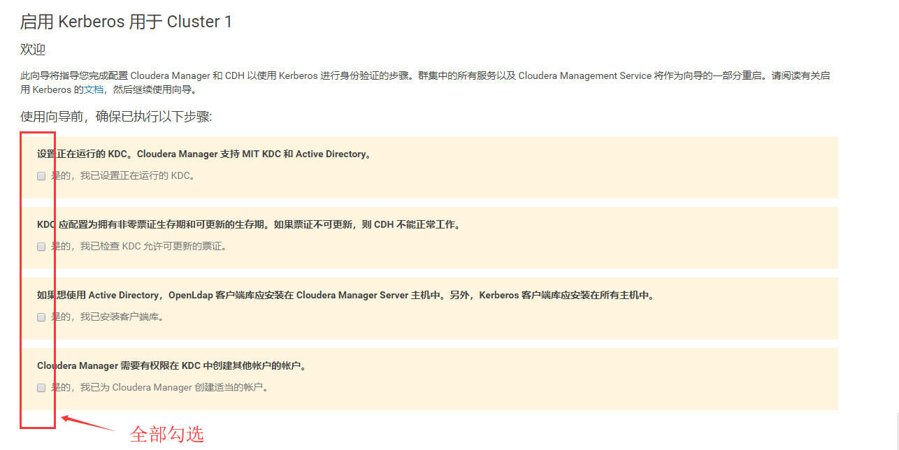 - 进入Cloudera Manager 管理页面启用 Kerberos