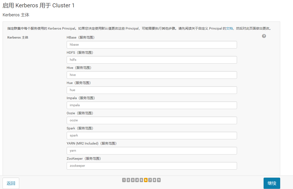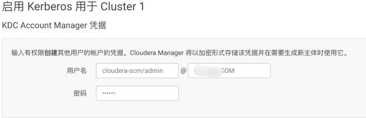 - .输入Cloudera Manager的Kerbers管理员账号,一定得和之前创建的账号一致,点击“继续”