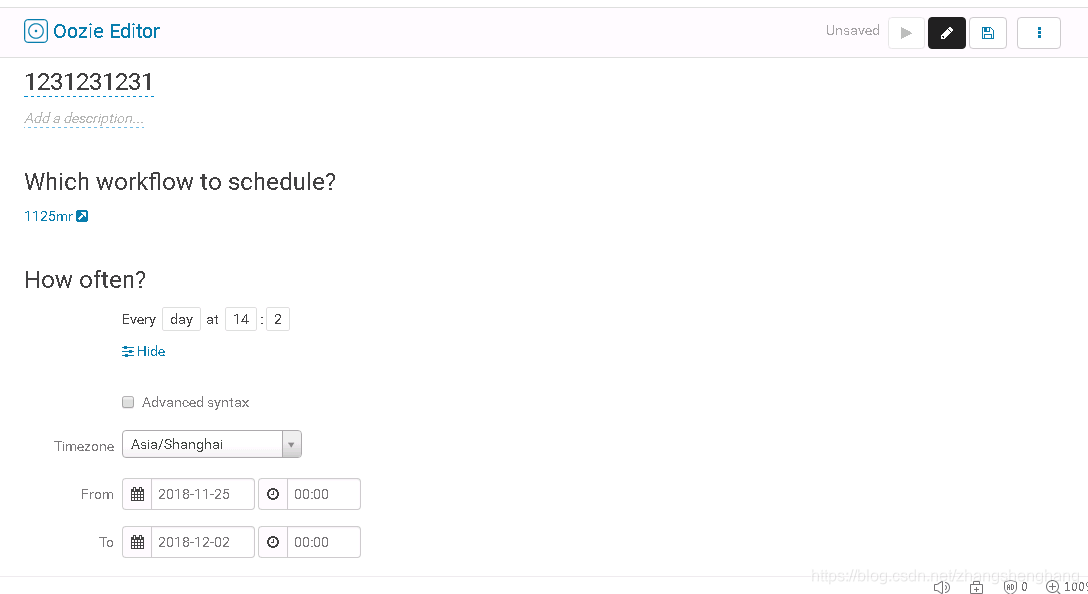 - 上面的开始和结束时间使用的是UTC时区,这个设置可以更改/etc/oozie/conf/oozie-default.xml中的oozie.process.timezone,默认为UTC。然后,Hue oozie对这个设置的更改不起作用,所以在使用hue oozie时,设置时间固定以UTC为基准,中国时间比其早8小时,一般要减去8小时。