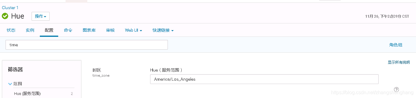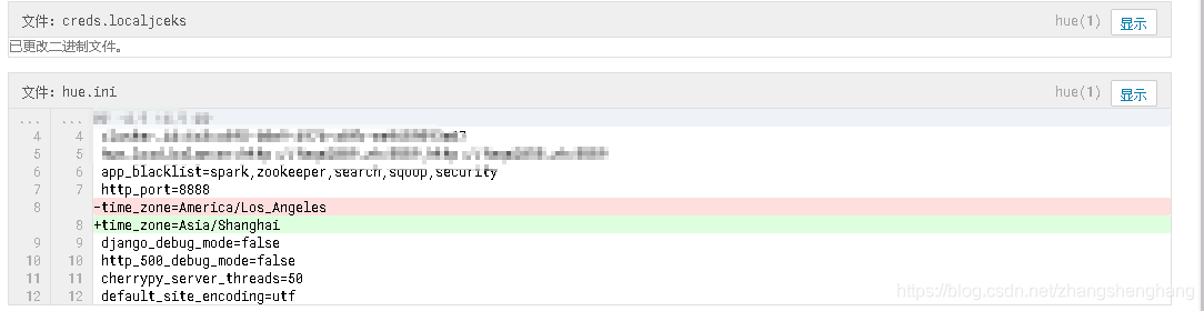 - Cloudera Manager中有关hue的时区的设置,默认为American/LosAngeles,这个时区设置使得hue oozie dashboard中任务的时间显示不能与中国标准时间一致,将其改为Asia/Shanghai,重启hue服务即可。
