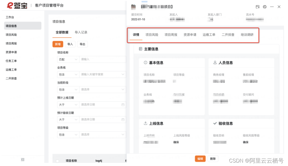 客户项目管理平台:包含了项目的基础信息记录、项目的跟进情况以及项目需要的资源记录和工单任务等模块。通过项目实时提交汇总,使得各个项目节点的任务一目了然。以项目信息提交为例:项目经理可以针对客户项目分别进行信息补充,对客户反馈的现场信息进行实时流转,同时在线持续推动项目进度,提升了沟通效率。