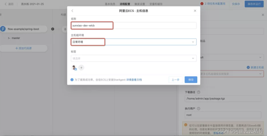修改一下”Java构建上传“的任务,增加一个打包路径,填入deploy.sh。这个文件存在于代码库中,其中包含了在ECS上进行应用启动的脚本,为了进行后续的主机部署,需要将这个文件也打入到压缩包中,在后续的主机部署任务中可以看到如何使用该deploy.sh。在该配置中指定了target/和deploy.sh两个路径,所以Flow会将这两个文件(夹)打包成为一个压缩包,并进行归档,在Flow中我们称之为制品,该制品也会在后续的主机部署任务中用到。