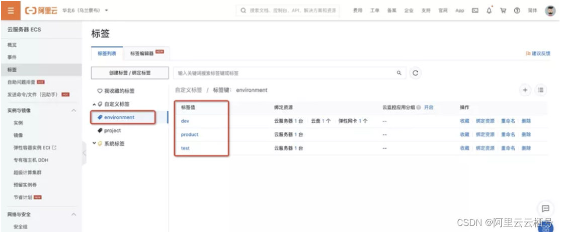 2、运维人员,根据需要,对相应ECS资源进行标签配置。标签是云资源的标识,可以帮助您从不同维度对具有相同特征的云资源进行分类、搜索和聚合,让资源管理变得更加轻松。本文中ECS资源及标签设置如图所示: