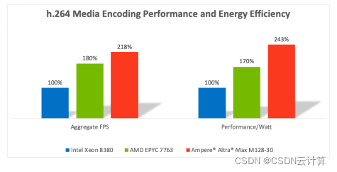 h.264 视频压缩标准用于编码、分发视频和音频。该标准于 2004 年首次发布,是现代云中最热门的工作负载之一。这项成熟技术已在传统的 x86 处理器上得到了广泛的优化。尽管如此,高核心数和每个核心的 2x128 位 SIMD 向量单元最终使Ampere Altra Max 在测试中表现优秀,编码性能比 x86 的AMD Milan 及英特尔Icelake 分别领先 1.2 倍和 2.2 倍;每瓦性能则分别领先 1.4 到 2.4 倍。