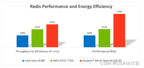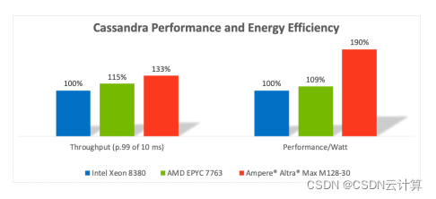 Apache Cassandra 是一种主流的分布式 NoSQL 数据库,具备高可用性和容错性。该项测试以 cassandra-stress 作为负载生成器,基于横向扩展的配置运行多个 Cassandra 实例。在 Cassandra 典型的以写入为主的工作负载上,Ampere Altra Max 的吞吐量较英特尔 Icelake 和AMD Milan 分别提高了 16% 和 33%,p.99 的延迟低于 10 毫秒。而在每瓦性能方面,Ampere Altra Max 是英特尔和 AMD 的近两倍,能效领先十分显著!