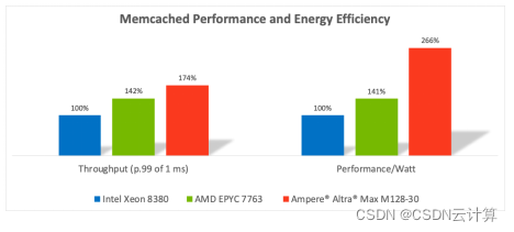 Memcached 是一种用于云计算的内存键值存储,它比 Redis 更早,目前已经部署了近二十年。测试结果显示,Ampere Altra Max 的吞吐量性能分别比英特尔 Icelake 和 AMD Milan 高出 74% 和 23%;每瓦性能则分别高出 2.6 倍和 1.9 倍。