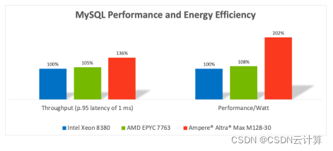 MySQL 仍然是云计算中最受欢迎的开源关系型数据库,是 LAMP(Linux、Apache、MySQL、PHP/Perl/Python)网络应用软件堆栈的组件,已有 20多年历史。虽然 MySQL 在技术上不是一个云原生的堆栈,但多年来,它已经适应了云的模式。目前,大多数公有云服务商都提供基于 MySQL 的网络服务。该项测试借助流行的 sysbench 基准测试工具,发现在吞吐量方面,Ampere Altra Max 与英特尔 Icelake 相比有 36% 的领先,比 AMD Milan 有 29% 的领先。而在能效方面,Ampere Altra Max 比英特尔和 AMD 都要高出近两倍。