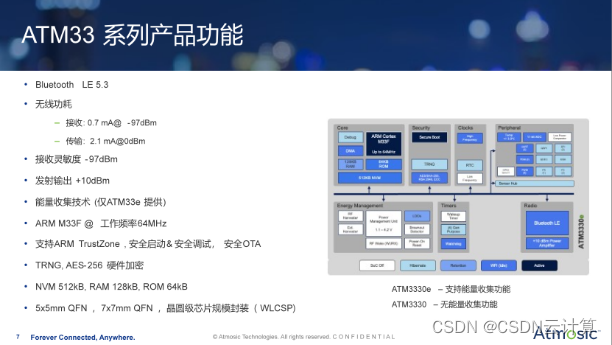 上面提到的三个基础功能都已经在ATM2和ATM3上实现了,而且现在已经搭载到了市面上成百上千万台的设备上。在此基础上,全新的ATM33系列也增加了其他额外的高级功能。首先是具备更强的处理能力;同时也采用了嵌入式非易失性存储器(NVM);提高了全系统的安全性,并且支持ARM TrustZone技术。ATM2和ATM3产品支持蓝牙5.0,现在ATM33系列已经扩展到支持蓝牙LE 5.1/5.2/5.3。还有一项非常重要的升级是,全新的ATM33系列支持AoA以及AoD的室内定位技术,主要是用于资产跟踪和寻向,这也是在蓝牙5.1中获得的支持。不仅如此,对光伏和射频能量收集器也进行了增强,希望能够支持不同类型的光伏能量收集器,以及进一步扩大能够接收的射频能量输入范围。