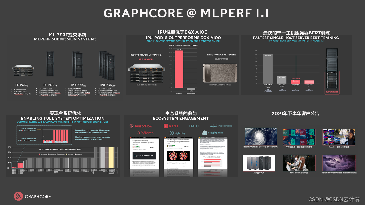 与 GPU、CPU 等芯片对比,Graphcore IPU 另一个重要的设计思想,是实现 CPU 与 AI 处理引擎的解耦,依据 AI 的不同场景,灵活和优化配置 CPU 与 IPU 的比例。为此,Graphcore 设计了一系列的系统级优化,例如对于谷歌的 BERT 模型,通常 NVIDIA 或 Intel 都是固定比例的架构,如 CPU 与 GPU 的 1:4 数量比,或 Intel 的 CPU 与 AI 加速引擎的 1:2 数量比。而 CPU 与 Graphcore 的 IPU 可以是 1:32,而基于计算机视觉,比例则又可以是 1:8。