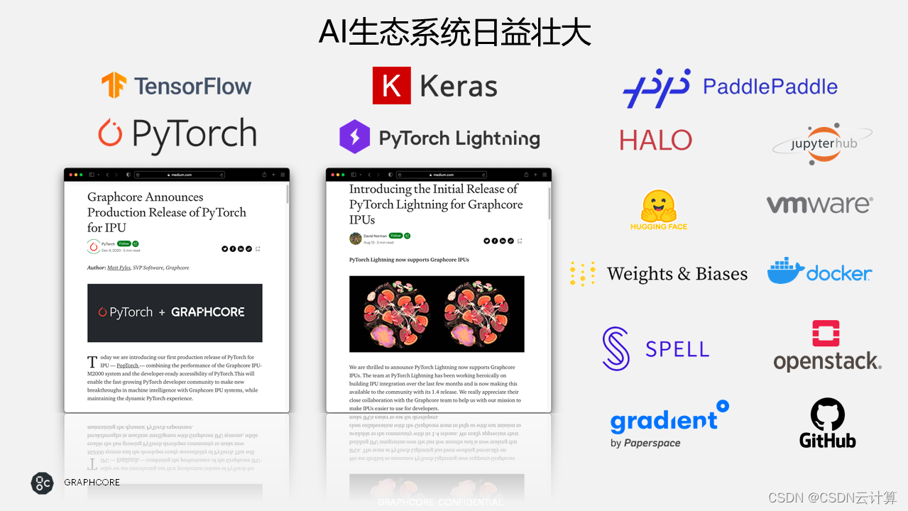 底层芯片之上,丰富的生态一直是芯片厂商重要的目标。在 AI 生态方面,Graphcore 已经与 PyTorch Lightning、百度飞桨、阿里云 HALO、Jupyter Notebook、Hugging Face、Weights & Biases、Spell、Gradient 等成为合作伙伴。