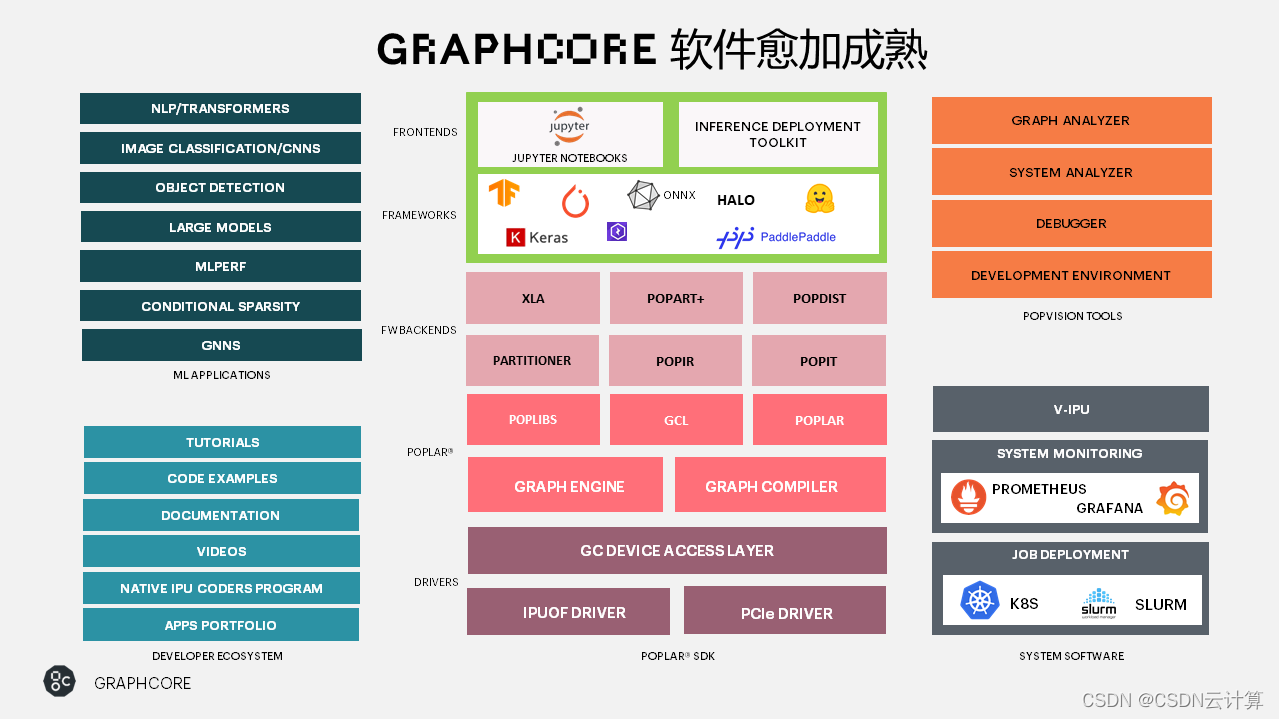 除了硬件之外,Graphcore 也在软件层面持续丰富和完善自身的技术与软件生态。在 Graphcore 的 Poplar SDK 中,在硬件相关的驱动、协议栈,和机器学习框架 XLA、图编译器、PopART 等之外,2021年 Graphcore Poplar SDK 增加了对 PyTorch Lightning、百度飞桨、Hugging Face 的支持,其中百度飞桨在 Graphcore IPU 上已经实现训练与推理的全面支持。此外,对开发工具、硬件管理与 IPU 虚拟化的支持也在增强。