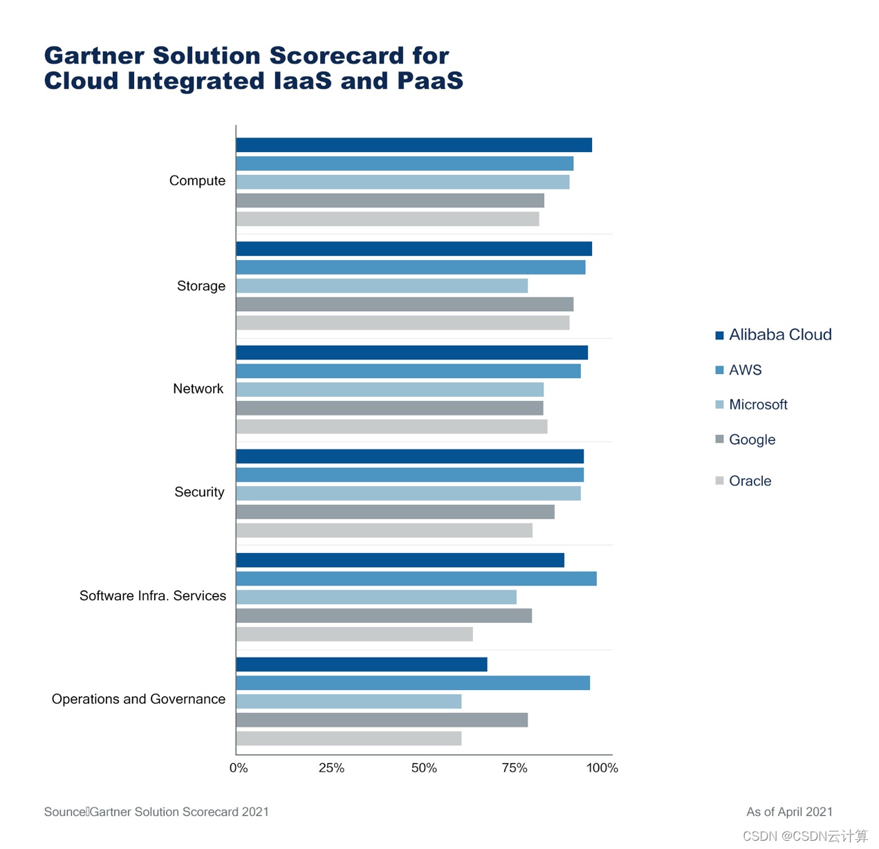 《Gartner Solution Scorecard 2021》是业内最权威的云计算评估报告之一,评估对象包括亚马逊、微软、阿里巴巴、谷歌、IBM和Oracle等全球顶级云厂商,评估维度包括计算、存储、网络、安全、软件基础设施、稳定性、运营、数字业务基础设施等9大类和270个子项。