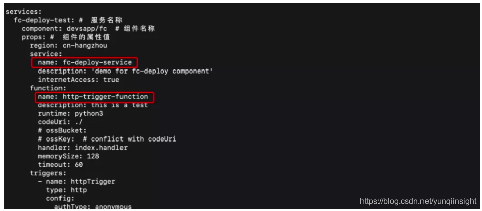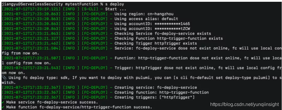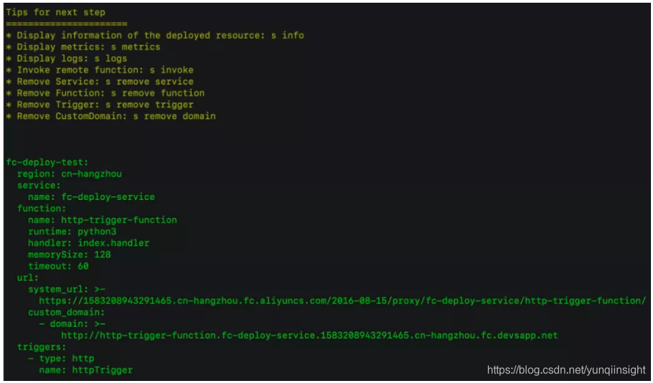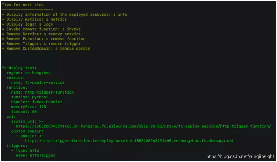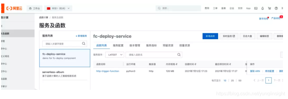 该项目部署到线上之后的表现就是在 cn-hangzhou 区创建一个 fc-deploy-service 服务,以及 http-trigger-function 函数。