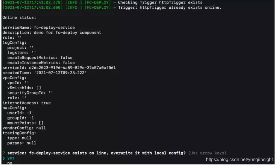 可以看到,系统已经感知到我们的代码变化,此时,我们选择yes,完成之后在查看线上资源: