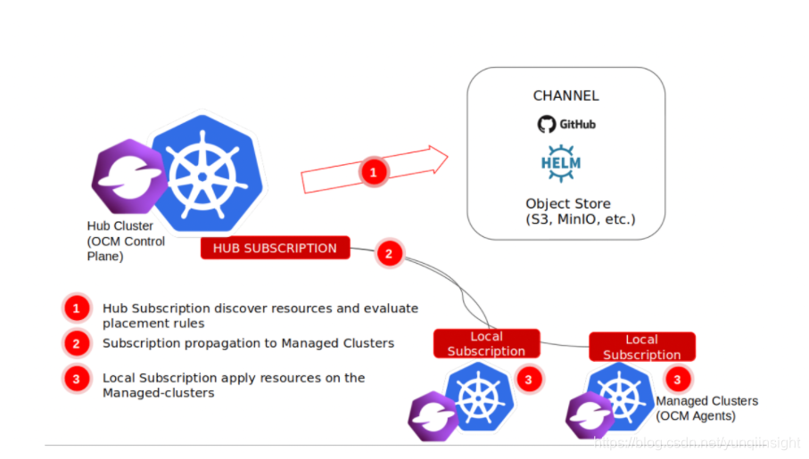 OCM 还内置了两个管理插件分别用来进行应用部署和安全策略管理。其中应用部署插件采用了订阅者模式,可以通过定义订阅通道(Channel)从不同的源获取应用部署的资源信息,其架构如下图所示: