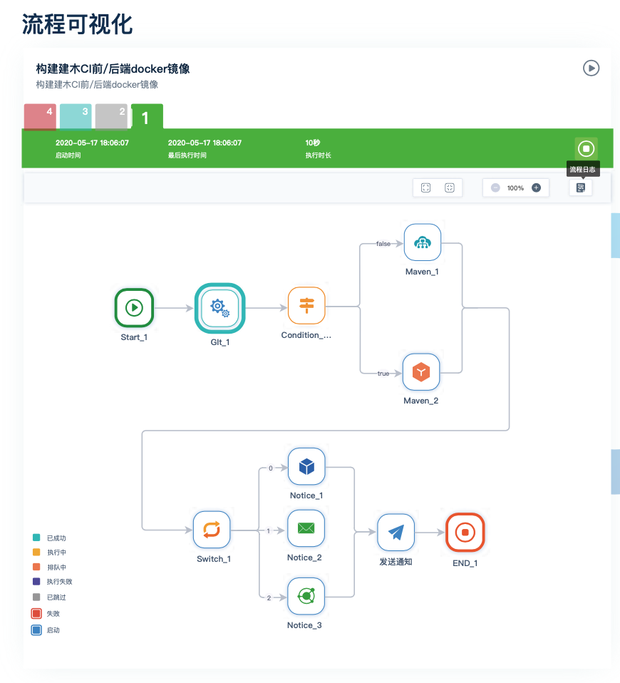 建木项目流程配置可视化,让任务编排与执行状态一目了然: