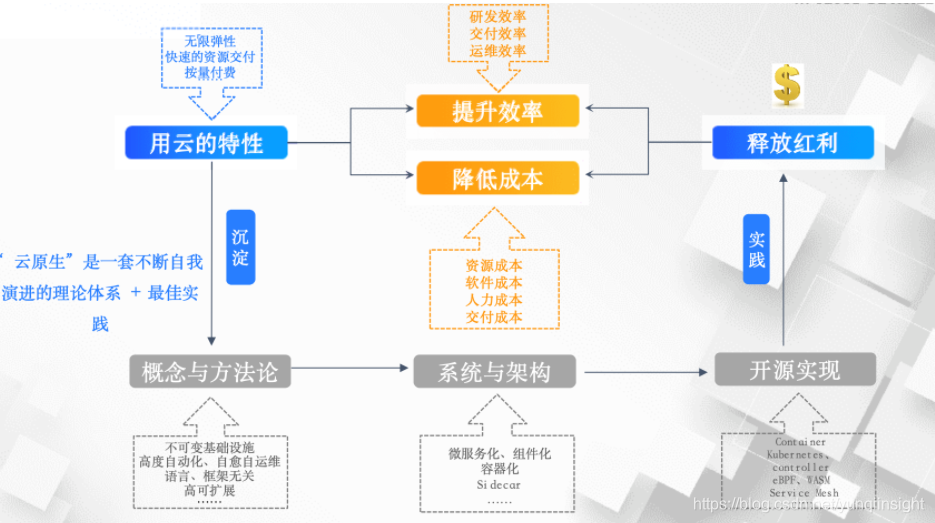 总体而言,你会发现这一套云原生的方法其实是一个很完善的闭环,先不断去地看、不断地去探索如何利用云的特性帮助用户去提效降本,然后把这一系列的方法或者这一系列的思想,总结沉淀成为云原生的概念和方法论,再通过一系列相应的架构和对应的开源项目将其实现,最后再让用户能够去使用这些技术,从而达到释放云计算红利的本质目的。