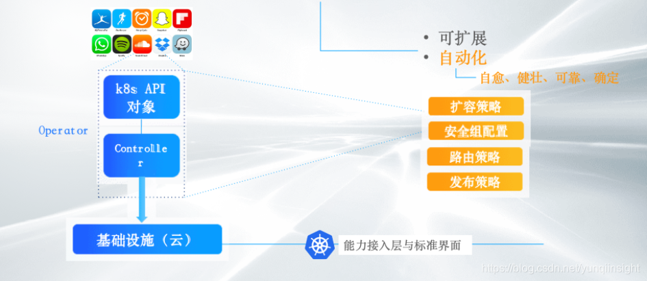 那么这也是我们今天在 K8s 安卓化的背景下看到的另外一个趋势,就是我的应用本身和业务所需要的能力会不断地往自动化方向去演进。这也非常符合云原生的理念,因为你的应用自动化和自愈能力越强,你就越能够去跟云去对接,人工需要去记录的成本会更低,时间也会更少,更多的是把我的自动化能力跟云去对接好,让云帮助我去解决所有问题。
