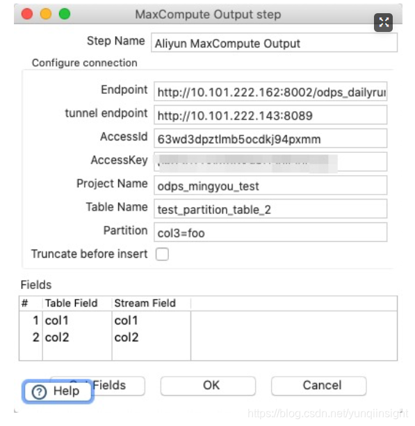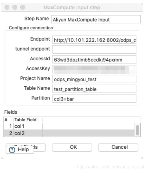 首先新建Transformation,之后新建Aliyun MaxCompute Input节点,配置如下:
