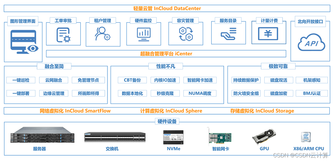 浪潮云海超融合是通过软件定义形成统一的资源池,提供计算、存储、网络、运维等一体化的基础设施服务平台,是用户最终实现云数据中心的最佳解决方案产品。它主要由计算虚拟化InCloud Sphere、新一代智能云加速引擎InCloud SmartFlow、企业级分布式存储系统InCloud Storage三大组件组成。