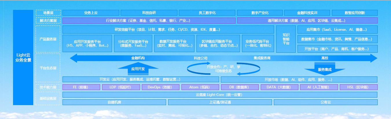 Light 云分为六层技术架构:最底层为基础设施层,借助于云原生技术栈,来自建机房、建设行业云、公有云的基础设施,可统一通过云平台管控应用交付和升级、运维等;次底层为技术能力层,包括前端、高性能、效能、低码、数据库、人工智能、区块链等技术能力;往上为平台生态层,将上述的技术能力通过开发云、开放市场开放出来,形成生态圈;第三层为产品服务层,让金融机构、科技公司、服务商、高校可通过平台来合作研发更多的产品和服务,并最终沉淀下来;第二层为解决方案层,针对金融领域,形成包括证券、基金、银行、私募等解决方案;从而形成最顶层,场景层,灵活应用于各类金融场景。