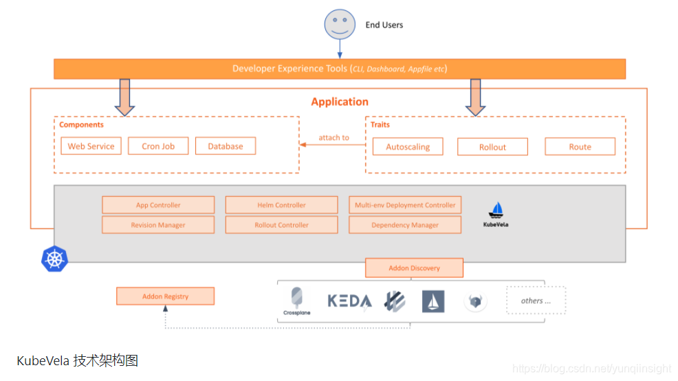 对于终端用户(例如应用程序开发人员)来说,这种用 KubeVela 构建的抽象将使他们能够以最少的努力设计并向 Kubernetes 发布应用程序 —他们要做的只是定义一个简单的应用程序,可以轻松地与任何 CI/CD 集成,而不需要管理一些基础设施细节。