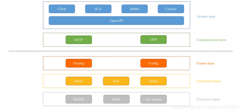 - 通信层包含HTTP和UDP,Nacos主要通过HTTP进行通信,少部分服务推送功能会用到UDP。