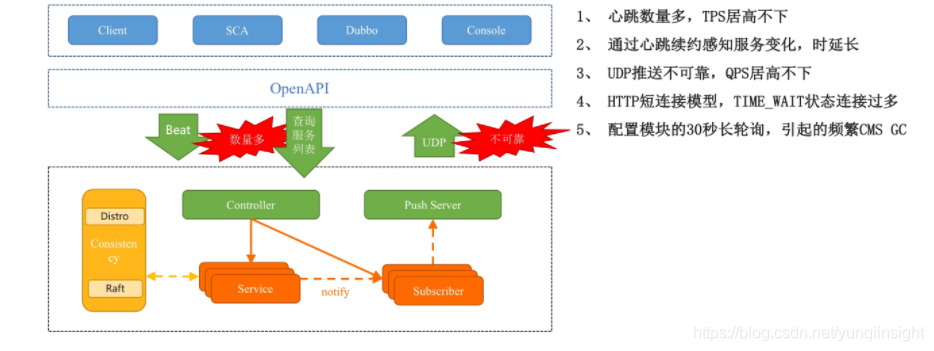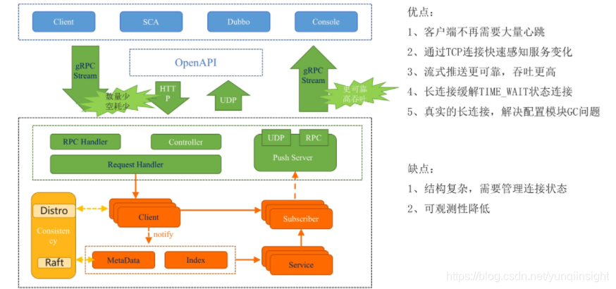 - 通信方式基于HTTP短链接的方式,Nacos侧释放连接会进入TIME_WAIT状态,当QPS较高时会有连接耗尽导致报错的风险,当然这里通过SDK引入HTTP连接池能缓解,但不能根治