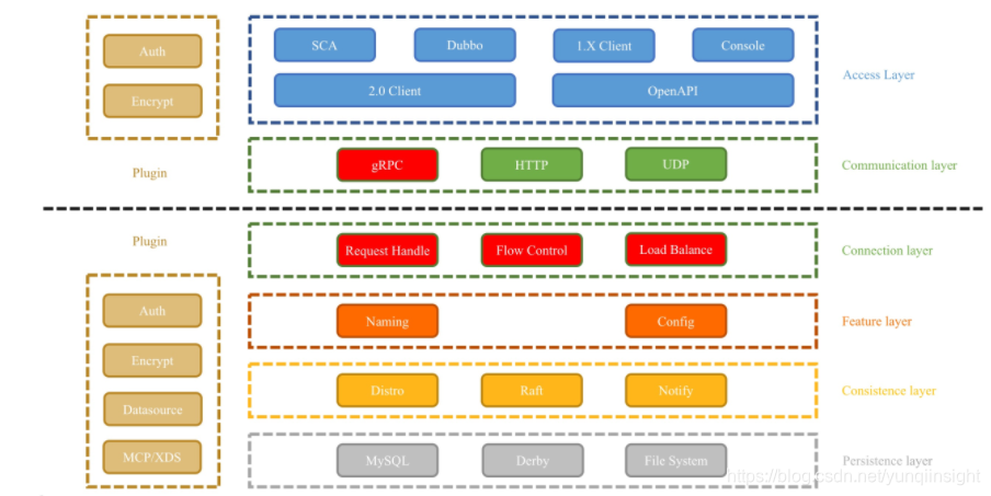 - 同步层包含AP模式的Distro协议(服务注册)和CP模式的Raft协议(服务元信息),以及配置通知的Notify同步方式