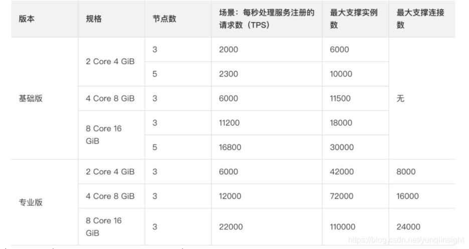 在服务发现场景对比基础版和专业版在2C4G、4C8G和8C16G规格下的性能数据情况。