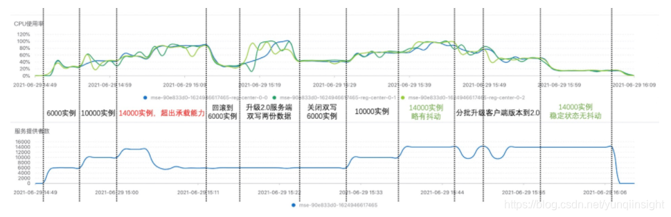 - 第三阶段在保持实例数为14000的状态下,分批升级客户端到2.0版本,CPU指标曲线不断下降至20%左右,并且整体处于稳定态无报错
