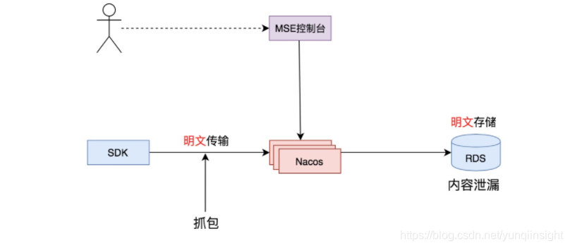 用户在使用配置数据时可能会将用户信息、数据库密码等敏感信息存放到Nacos中,而Nacos存储配置数据都是明文传输、明文存储的,在数据库内容泄漏或者传输层抓包时会导致敏感配置数据项泄漏,整体安全风险非常高。