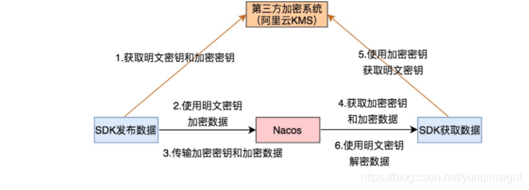 SDK在发布数据时会先从KMS中拿到密钥和加密后的密钥,然后使用密钥对数据进行加密,接着将加密数据和加密后的密钥传输到Nacos存储。SDK会从Nacos获取加密数据和加密后的密钥,然后通过加密后的密钥从KMS获取明文密钥,接着通过明文密钥对加密数据进行解密获取明文数据,解决了整体传输和存储中的数据安全问题。