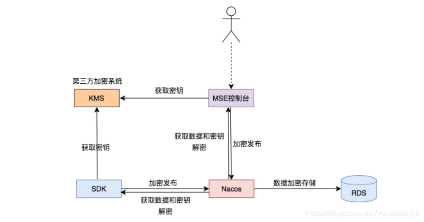 用户可以通过SDK和MSE控制台对敏感数据进行加解密,整体SDK和MSE控制台都会先访问KMS再加密存储配置数据,然后解密之后再展示明文,使用流程和之前明文存储一致