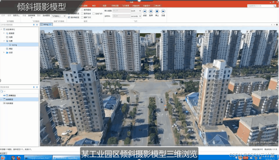 某智慧城市项目基于“龙芯+中标麒麟+ SuperMap”方案构建的系统,可高效加载上百平方公里倾斜摄影模型数据,加载、运行稳定、流畅,浏览体验效果良好,为该项目的数字底盘建设和后续分析应用起到重要支撑作用。在信创时代,全国产化基础环境可确保军事、政企信息化等项目安全落地。