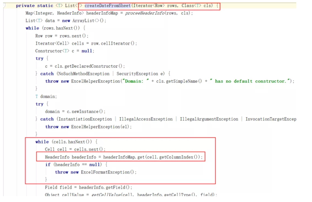 项目中有使用到 com.github.dreamroute excel-helper 这个工具来辅助 Excel 文件的解析,出错时的代码是这样写的:如下所示(非源代码)