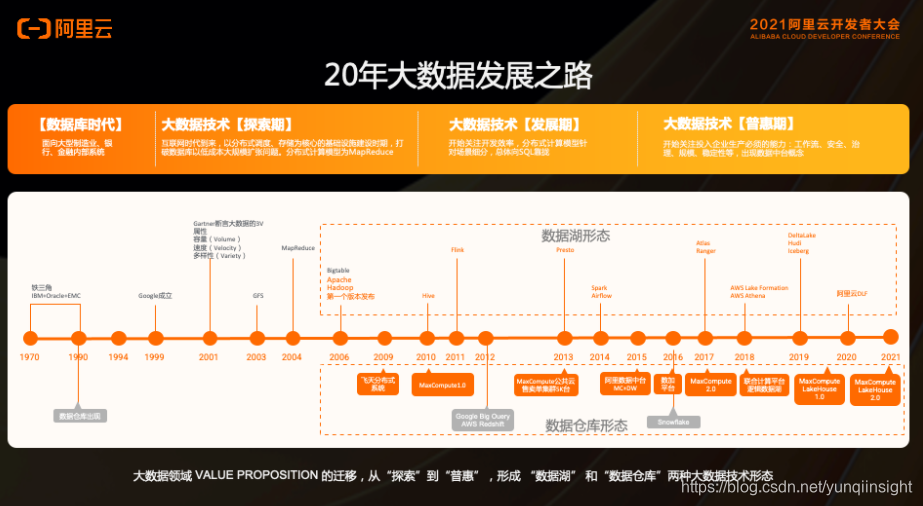 现在我们所处的这个阶段,也就是2015年左右,我们进入了大数据普惠阶段。这个阶段我们有观察到两个趋势。第一个趋势,大数据技术的发展除了追求规模,性能之外。更多的是看数据安全、数据治理、稳定性、低成本等企业级能力。我们也可以看出来,阿里巴巴 基于MaxCompute ,构建出了非常有阿里特色的数据中台系统。开源体系,也发展出了Atlas和Ranger,主要围绕血缘、治理、安全等开源项目。第二个趋势,随着AI、IOT、云原生技术的发展,对于非结构化数据处理的需求越来越强烈。使用云上对象存储作为统一存储的趋势越来越明显。Hadoop的体系也逐渐由HDFS为统一存储,发展为云上像S3、OSS这样的云存储,做为统一存储的数据湖体系。与此同时,出现了很多数据湖构建,像AWS Lake Formation以及阿里云发布的DLF这样的产品。仓的这条线,也在为了适应这样一个趋势,我们也在跟数据湖做很密切的联动,发展出了外表,通过外表的方式,可以对数据库里面的数据进行联邦计算。