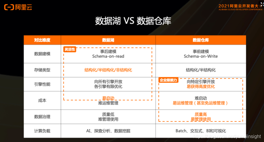 整体上来讲,数据湖更偏灵活性,数据仓库更偏企业级能力。那么这两种特点对于企业到底意味着什么呢?我们用下面这张图来表示。