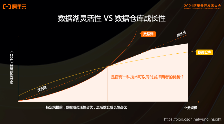 横轴是代表企业的业务规模,纵轴是代表企业搭建一套大数据系统所需要的成本。在企业初创的时候,整个业务规模还不大,数据从产生到消费的整个链路,是一个探索和创新的阶段。在这个阶段使用数据湖是非常容易启动,成本也是比较低的。但是随着业务的发展和壮大,参于的人员和部门越来越多,对于数据质量管理、权限控制、成本要求会越来越高。这个时候再使用数据湖,成本是指数级上升。所以这个时候适合用数据仓库,可以做好成本控制、数据质量管理等。从上图可以看出,对于一个企业来讲,在不同的阶段,数据湖和数据仓库都发挥着各自关键的作用。那是否有一种技术或者架构能同时发挥出两者的优势呢?