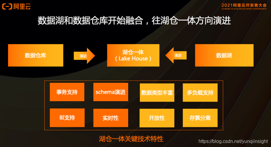 以阿里云对业界的观察和本身大量的实践,我们认为数据湖和数据仓库正在发生融合。并且它们以各自的方式,向着湖仓一体的方向进行演进。从上图中可以看出,数据仓库到湖仓一体的演进方向,数据湖到湖仓一体的演进方向,两者是相反的,相对的。那么在它们各自的演进上面需要做什么工作呢?