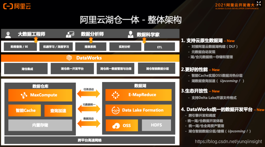 近期阿里云正在灰度一个功能,智能Cache,此功能可以实现OSS到仓里面智能化的数据分层。MaxCompute 在2020年发布了查询加速功能,未来一个版本我们会把查询加速引擎也投射到数据湖上面,让它能够支持数据湖上面的查询加速。