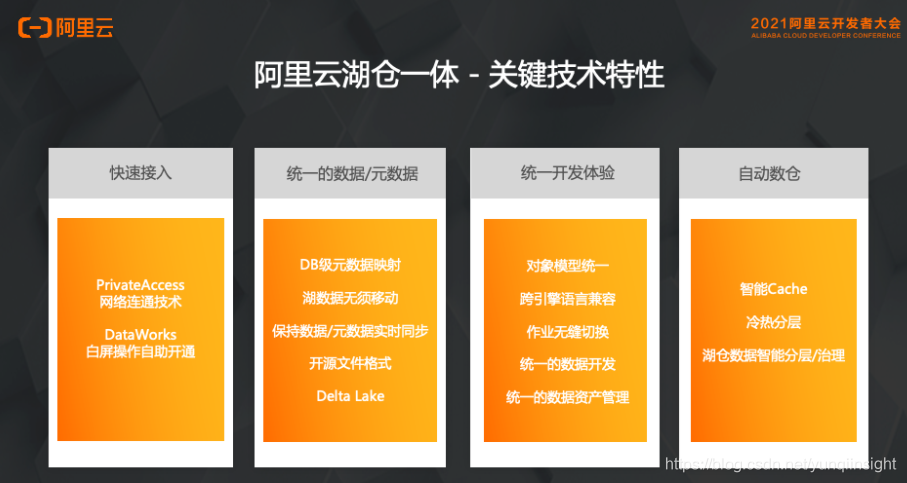 不管是从上下结构还是左右结构演进过来的湖仓一体,最终都应该是一个简单易用的系统体系。阿里云湖仓一体有四大关键特性,这四大关键特性都是在围绕怎么把数据湖跟数据仓库做到更加易用。