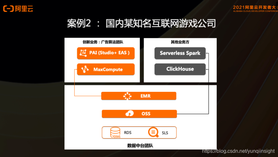 •通过湖仓一体将新业务平台与原有数据平台打通,PAI on MaxCompute + DataWorks 为客户创新业务提供敏捷、一站式机器学习模型开发、训练、模型发布,大规模计算能力、EAS 模型发布流程;