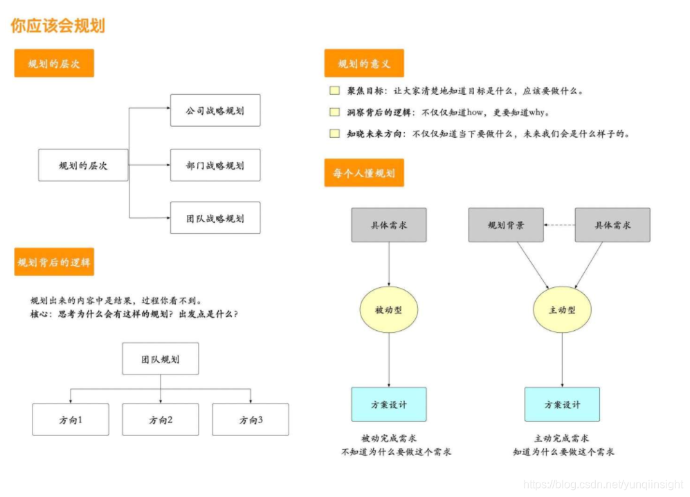 规划不仅仅是高层的事,每个人都要学会规划,只是每个人规划事情的格局不一样,高层做战略规划,下面的人做战术规划。规划也是分层次的,有战略规划、部门规划、团队规划、个人规划,站在每一层中,你看到的内容是不一样的,一般都是高层规划包含底层规划,底层规划支撑高层规划。