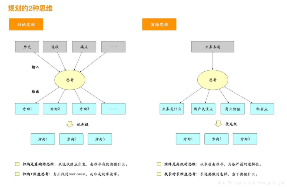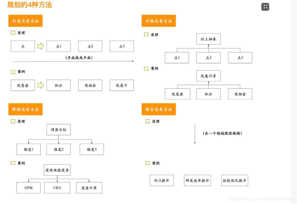 方法只是一种工具,让我们更好地去工作,但我们不能过分去强调方法,本质上还是要回归到业务认识上,正所谓"巧妇难为无米之炊",同样的道理,对业务没有思考,空有方法也是没有用的。笔者的建议是不同的人有不同的规划方法,真正吸取一两个人的方法之后,真正去实践,从实践中再总结出适合自己的方法。不同的人对方法的表述不一样,本质上是大同小异的,真正掌握4、5种方法就足够用了,不用贪多,把方法的原理、思路了解好了,多去实践,在实践中再去体会,多规划几次,你也就懂了。