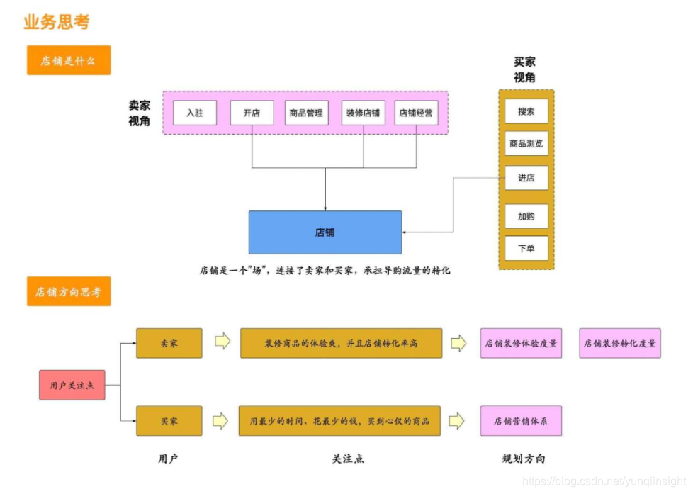 针对这两种角色,卖家最为关注的是怎么使用得好店铺,包含使用得爽、店铺转化好;买家最为关注的是怎么通过最少的钱、最少的时间买到心仪的商品。沿着卖家和买家关注点,继续思考我们怎么让卖家用得爽、用得好呢?其中一个点是我们要知道卖家现在有哪些不好的体验,一定要能度量得出来,而不是定性地去分析,当定量地度量出体验指标之后,这样就非常有针对性去做一些体验优化工作。站在买家的角度,可以给买家一些优惠,让他更愿意购物,这也即是我们规划店铺营销的初衷。
